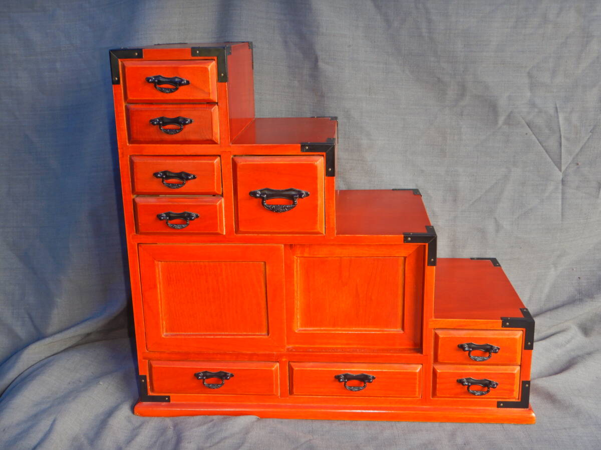 - 民芸品 陳列棚 薬箪笥 階段箪笥 小物入れ 小引き出し 小箪笥 時代箪笥風 時代家具風 珍品台 飾台 和家具 古家具 桐材 木製 ほぼ未使用品