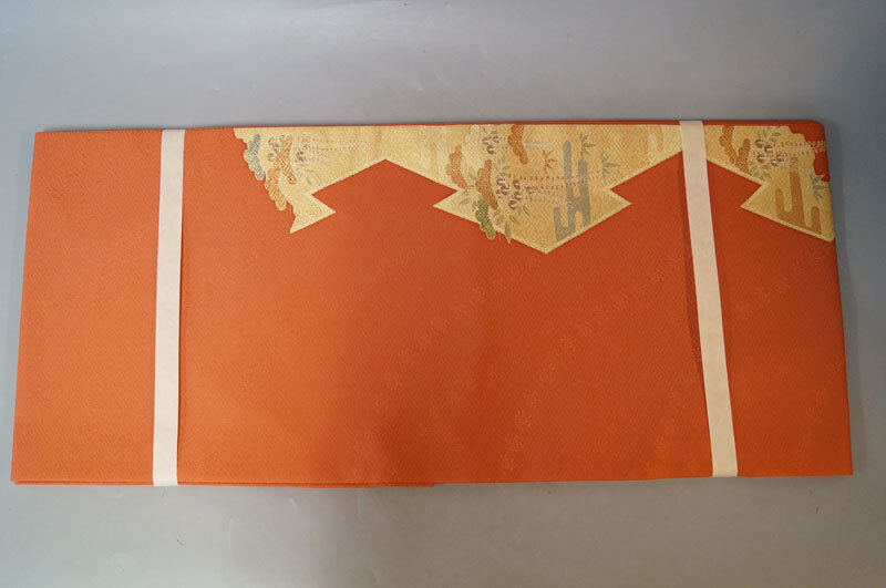 > ye62 未使用 本袋帯 ちりめん松皮菱 オレンジ 金糸 着物 最高級 仕上がり品 着物帯 和服 和装