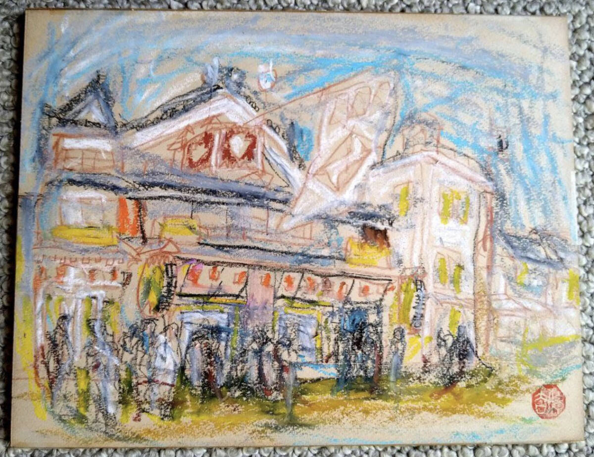 - 【お買得】パステルによるスケッチ 風景画 肉筆 マット付きガラス額入り 作者未詳 「吉伸」の落款有り 真作か模写か不明