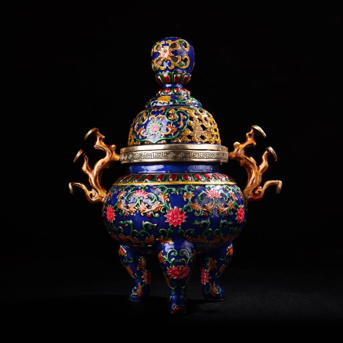 - 蔵友旧蔵出 銅製 景泰藍 琺瑯彩 雙靈芝耳三足 熏香爐 希少珍品 貴重品 置物 古賞物 密宗密教 供養品 仏教美術品
