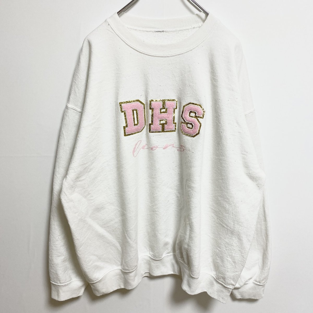 > 古着 used DHS 長袖ワッペンスウェット トレーナー 白 ホワイト クルーネック レトロデザイン 秋冬服 ビッグシルエット