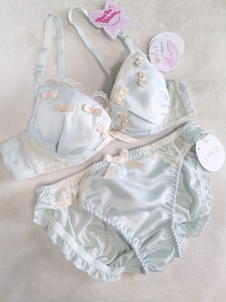 > お泊まりに☆B70ブラ&パンティ上下お揃い☆未使用☆可愛いプチリボン&レース☆パステルグリーン☆匿名配送可☆タグあり☆