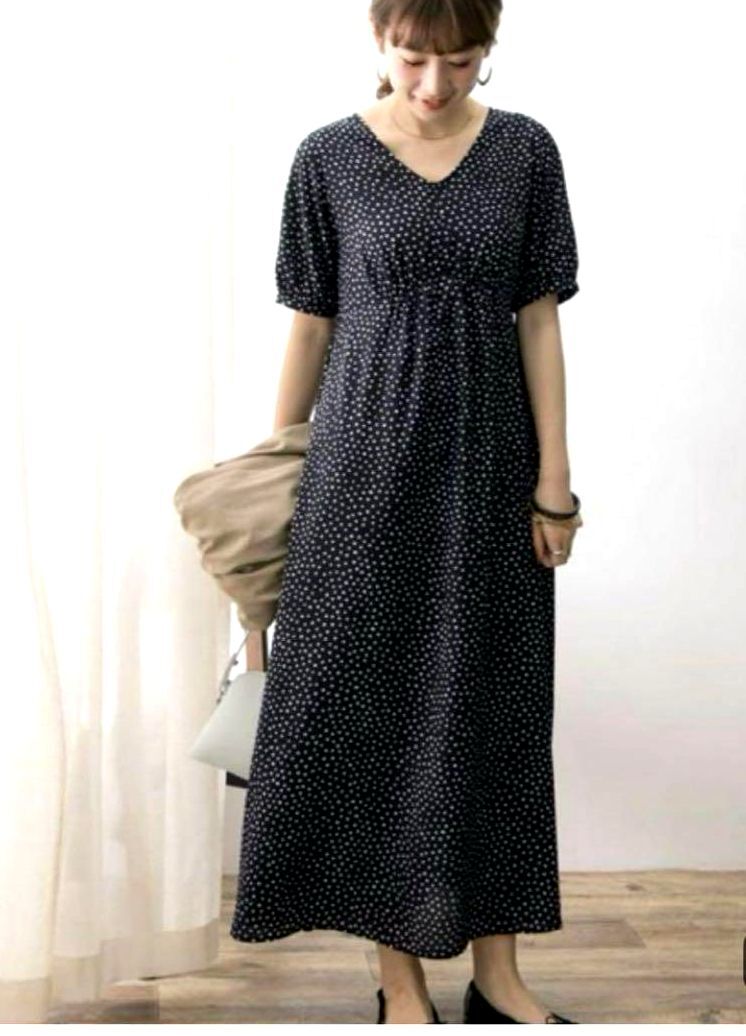 - アーバンリサーチ 黒 変形ドットプリント Vネックロングワンピース URBAN RESEARCH