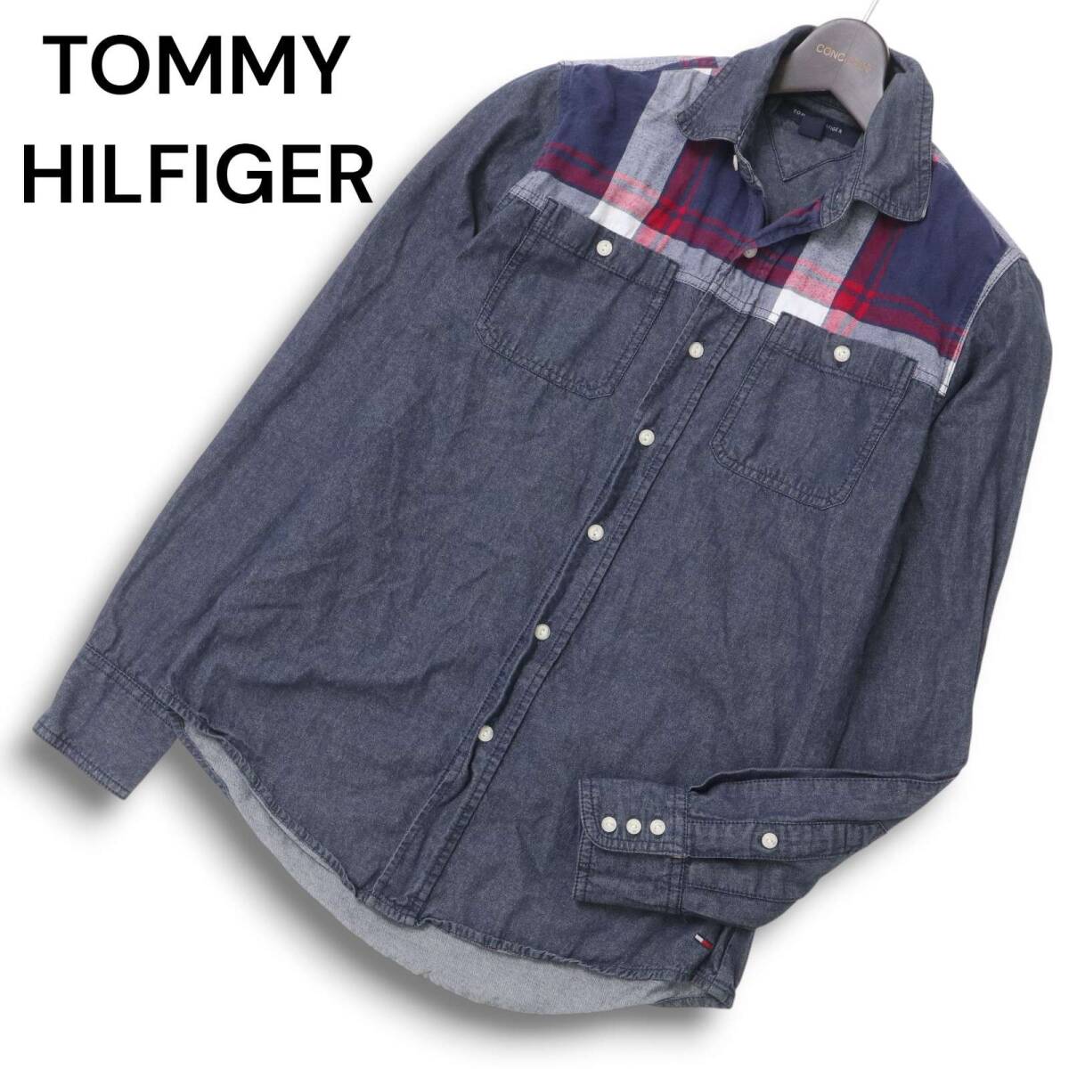 > TOMMY HILFIGER トミーヒルフィガー 通年★ 長袖 チェック 切替 ワーク デニム シャツ Sz.XS メンズ