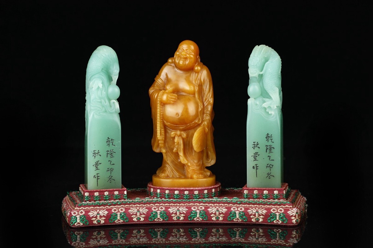 - 「清 秋堂作 老寿山石 田黄艾葉緑石彫り 龍鳳呈祥 弥勒仏 套章」極細工 擺件 古賞物 中国古美術 旧蔵出