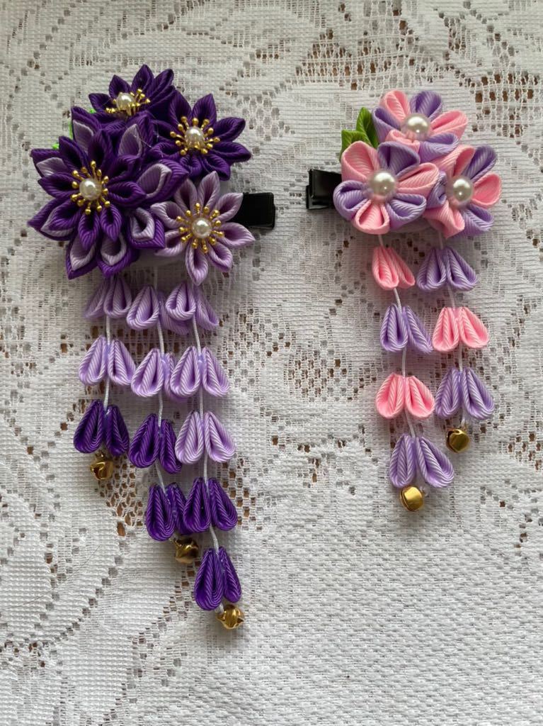 - つまみ細工髪飾り 七五三髪飾り 成人式 卒業式 深紫 薄紫 ピンク