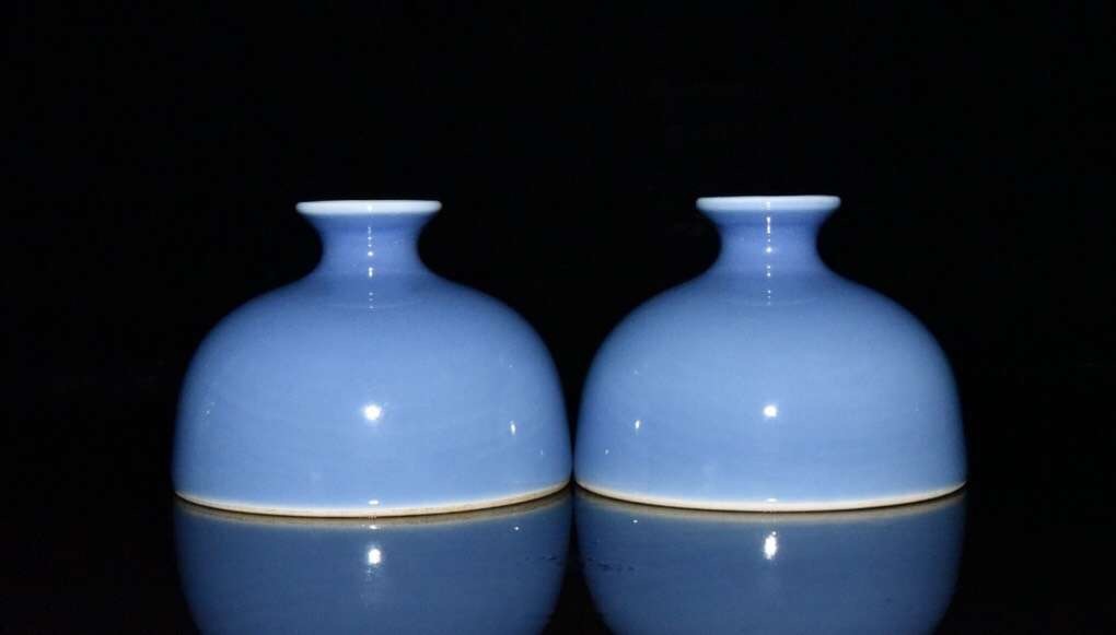 > 蔵友旧蔵出 清 乾隆年製款 天藍釉 太白尊一對 稀少珍品 貴重品 古陶瓷品 置物 古賞物 中国古玩 中国古美術品