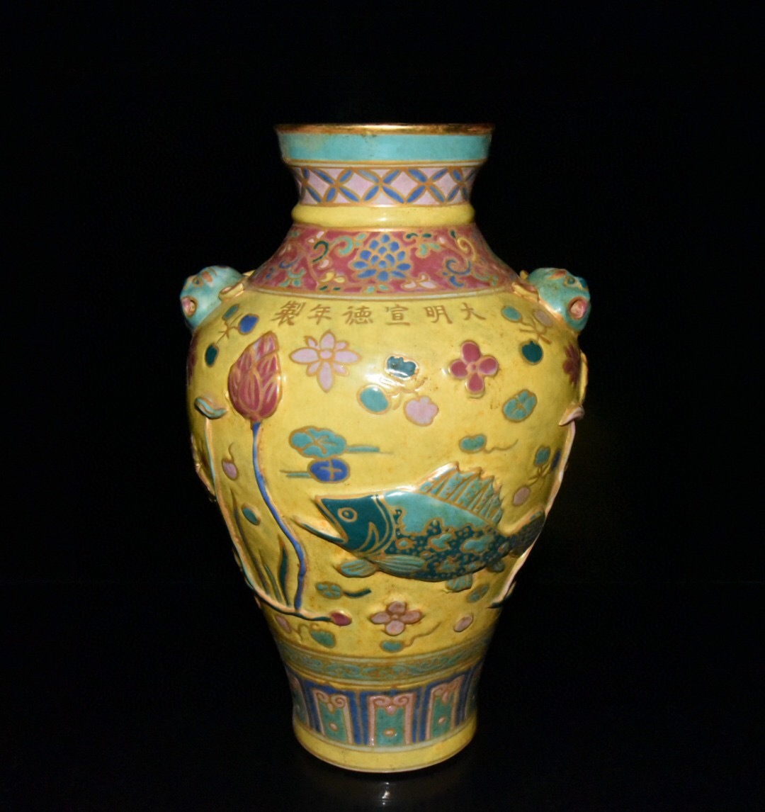 - 蔵友旧蔵出 明 宣德年製款 五彩 描金 魚草紋 梅瓶 稀少珍品 貴重品 古陶瓷品 置物 古賞物 中国古玩 中国古美術品