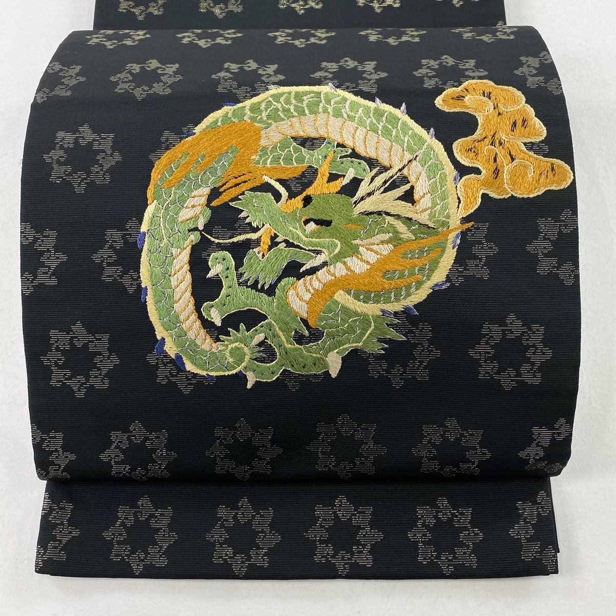 - 袋帯 美品 逸品 龍 霊芝雲 刺繍 箔 黒 お太鼓柄 正絹 【中古】