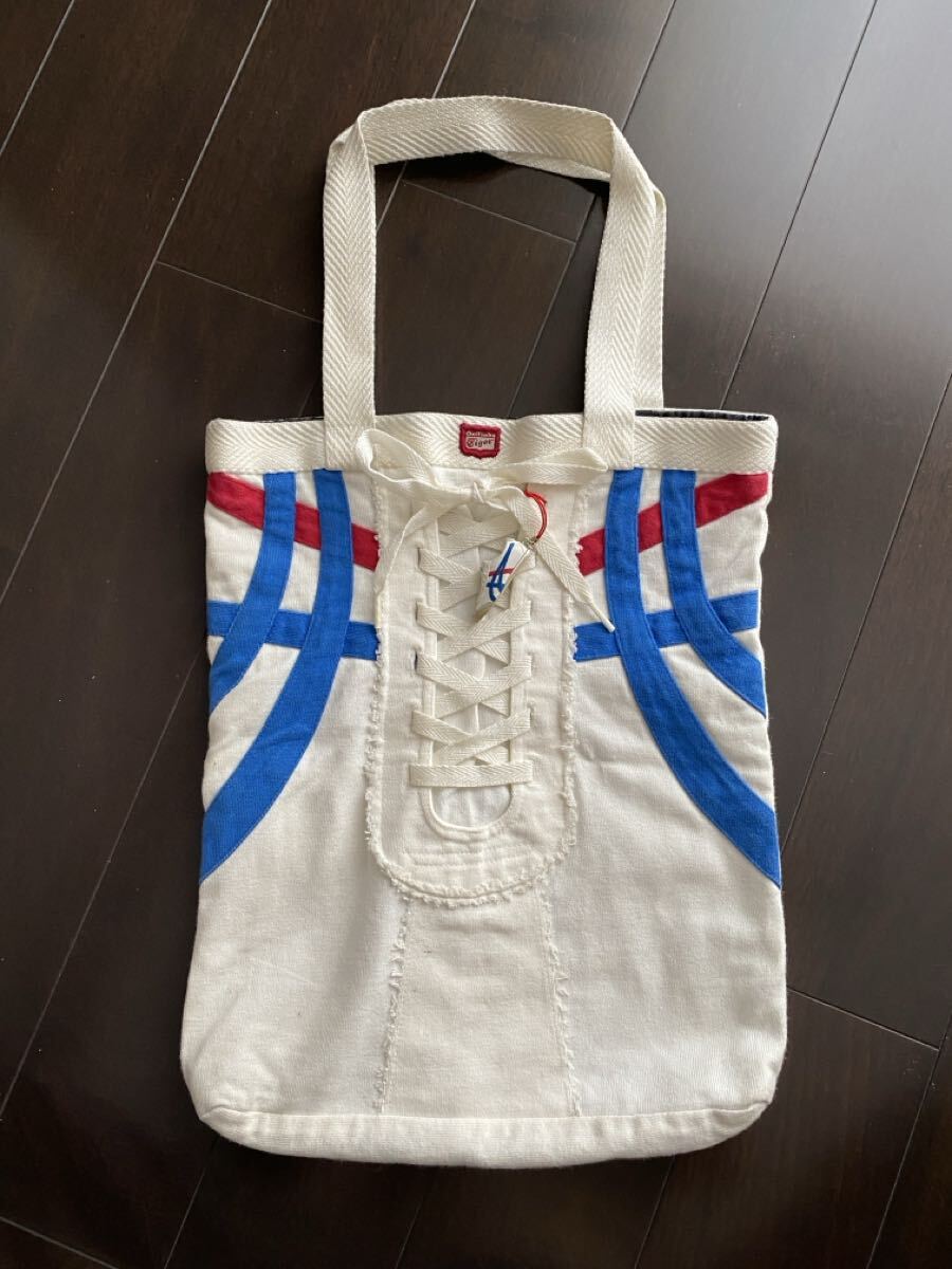 - オニツカタイガー☆布バック初期型スニーカー柄 ♪スニーカーマスコットおまけ 布製トートバッグ キャンバス アイボリー 昭和レトロ