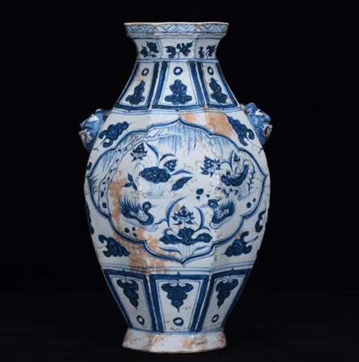 - 『館蔵珍品 元 古陶瓷品 青花 鴛鴦戲水紋 虎頭八方瓶』置物 賞物 貴重物品 収蔵品 中国古美術