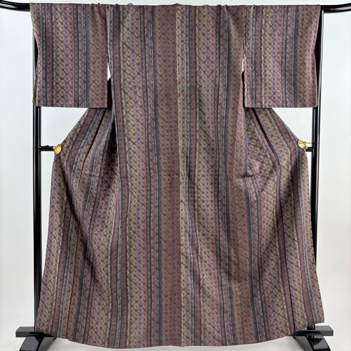 - 小紋 身丈162cm 裄丈68.5cm L 袷 紬地 やまと 縦縞 幾何学 絞り 濃紫 正絹 名品 【中古】