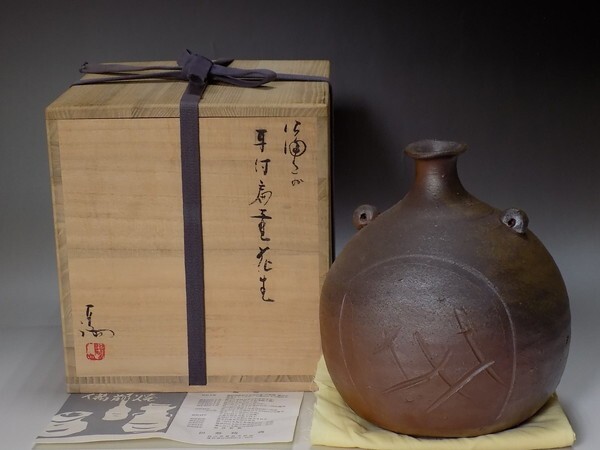 - ☆mori412☆備前焼 伊勢崎満 耳付扁壺花生☆岡山県重要無形文化財