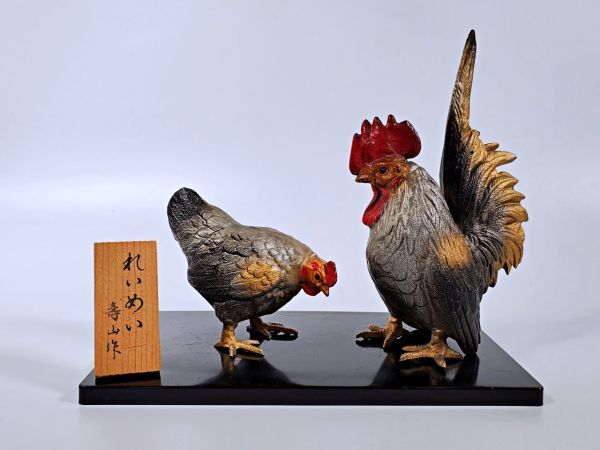 - 美品 真鍮製 鶏 置物 まとめて 2点セット つがい鶏 れいめい 壽山作 じゅざんさく にわとり ニワトリ 鷄