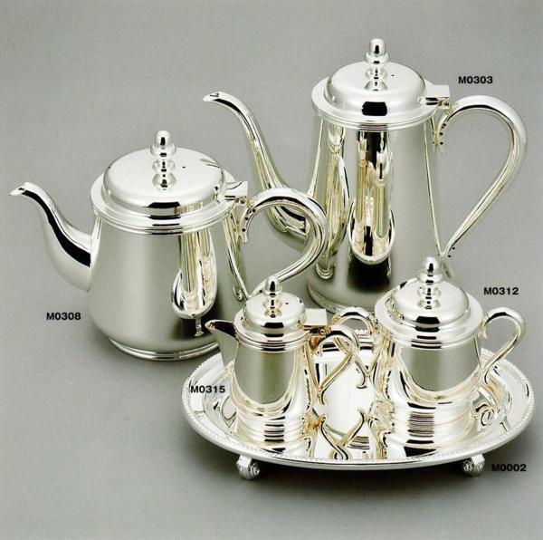 - ★早川シルバー洋白銀器VIPM型コーヒーポット・ティーポット・シュガーポット・ミルクポット・足付小判トレー5点セット日本製新品