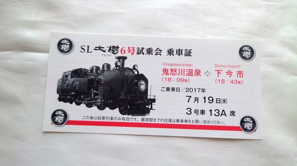 - ★東武鉄道★鬼怒川温泉→下今市 SL大樹6号試乗会乗車証★2017年