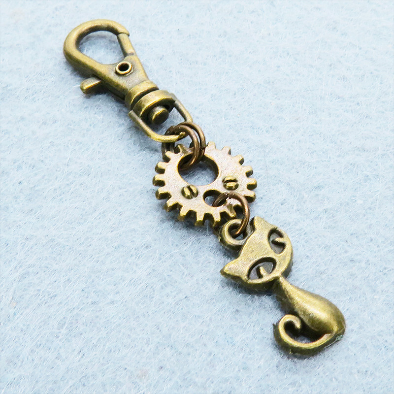 - アンティークゴールド 猫と歯車・ギアを組合せたコンパクトなキーホルダー 金具交換可