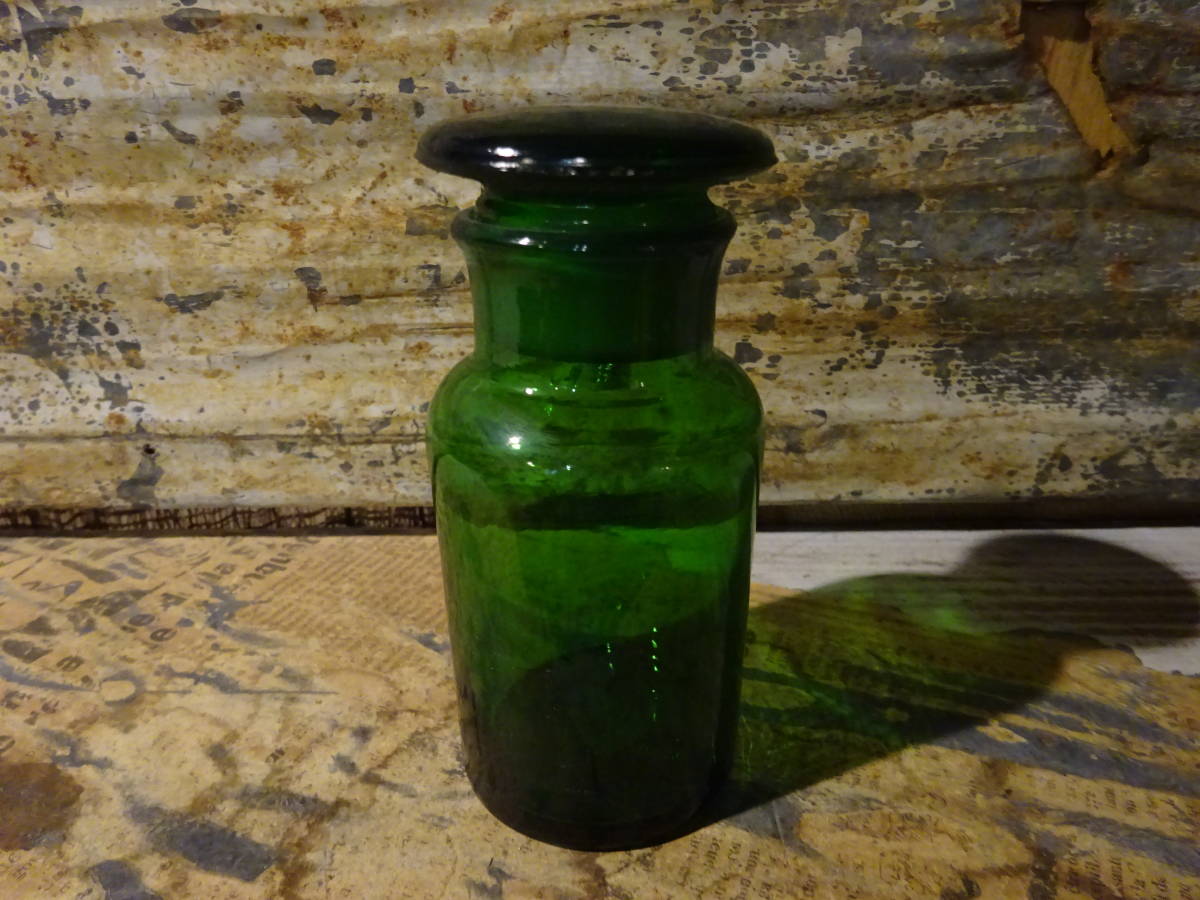 - 【蓋付グリーンガラス瓶】デッドストックカフェ古道具アンティーク猫瓶キャンディポットピクルス気泡ガラス駄菓子屋インテリアガーデニング