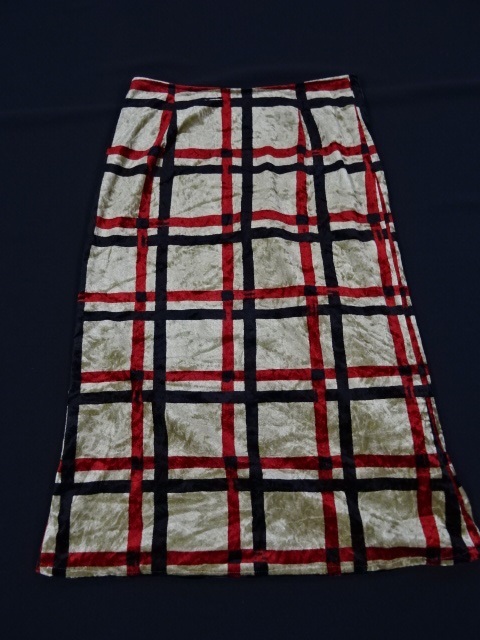 > タイトスカート タッタソールチェック柄 チェック柄 ベージュ×紺×赤 ベルベット風 DiABROH 古着 USED レディース スカート 可愛い 格安