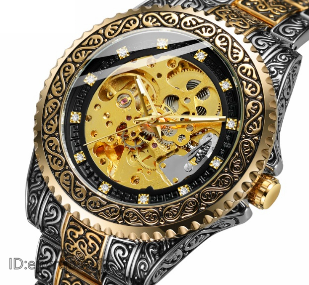 - 男性腕時計 機械式自動巻 新品 メンズ ウォッチ スケルトンデザイン 彫り花柄 3針(時、分、秒) 紳士用 通勤 /ゴールド