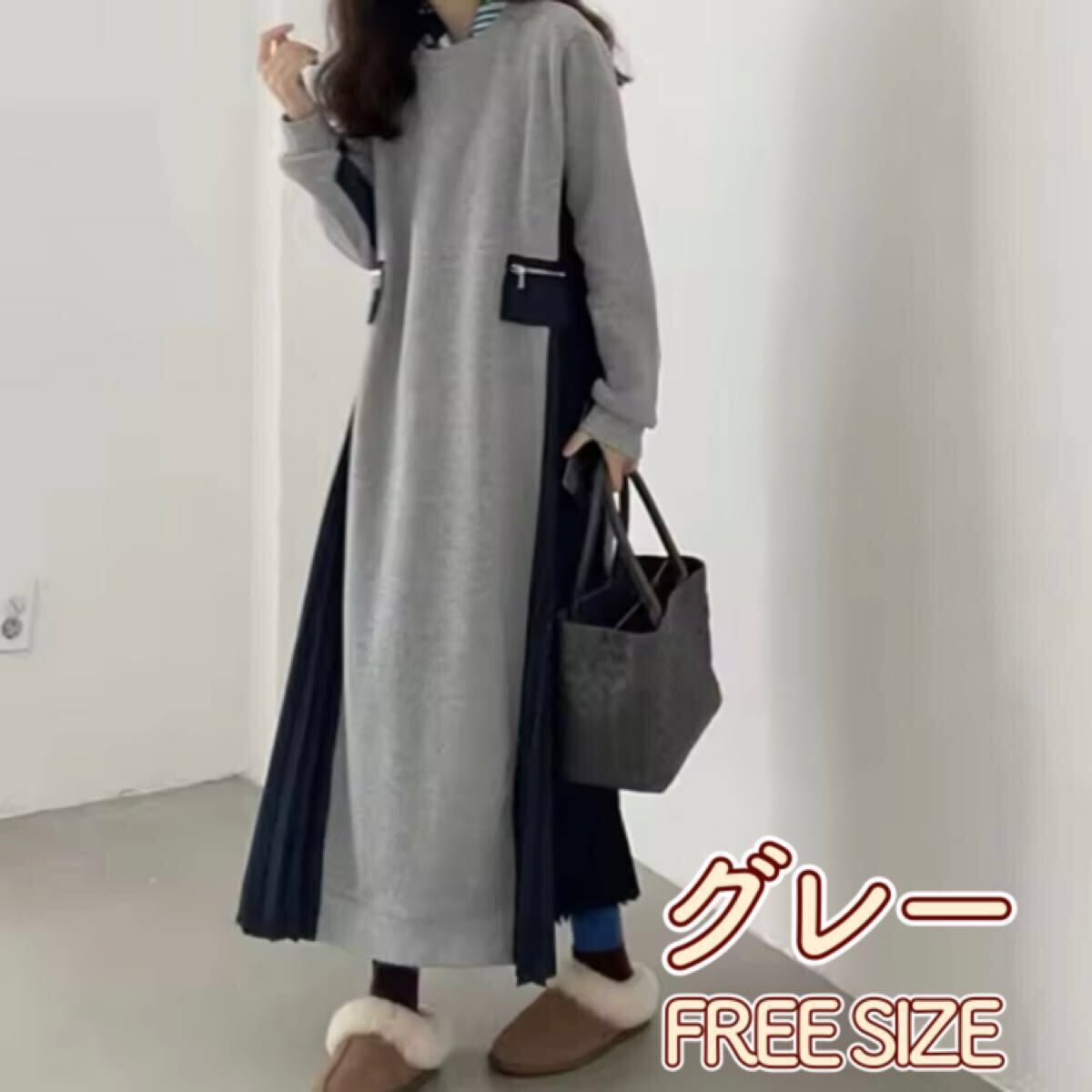 - ロングワンピース グレー ロンT 長袖 フリーサイズ 異素材ドッキング プリーツ 切替 カジュアル 大人可愛い