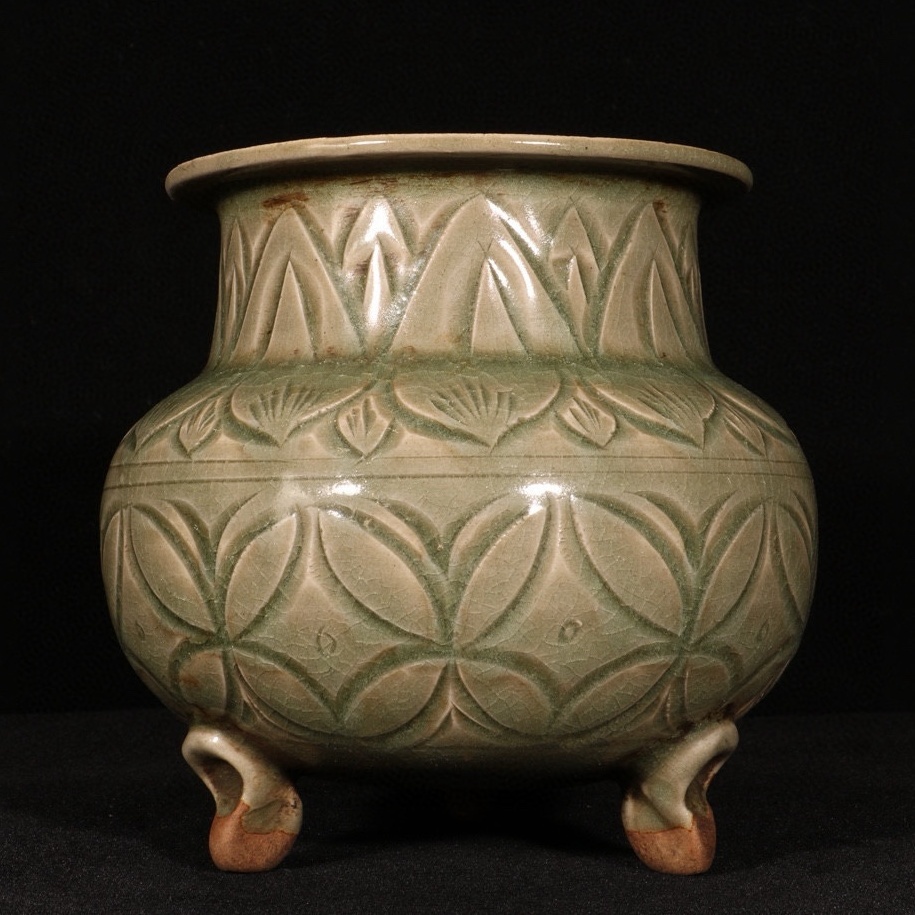 - 秘藏 宋時代 耀州窯 刻花三足香炉 時代物 汝窯 唐物 陶磁器 中国美術 高さ12.8 cm 直径13 cm 古物保証 820