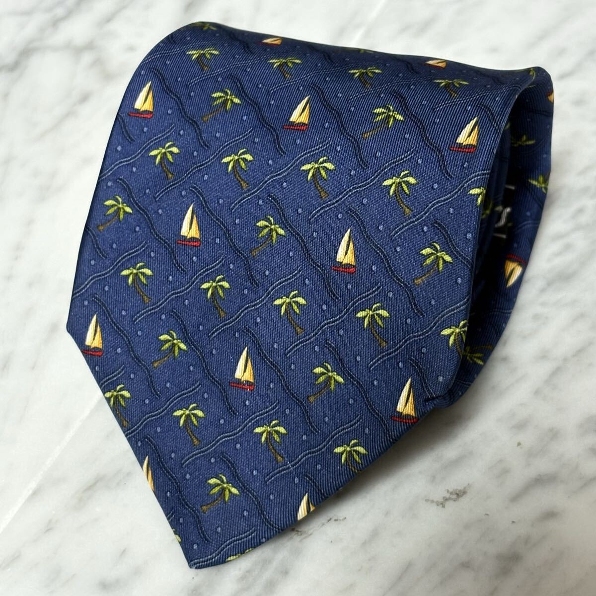 - 999円~ Ferragamo ネクタイ ネイビー ヤシの木 ヨット柄 (B14)