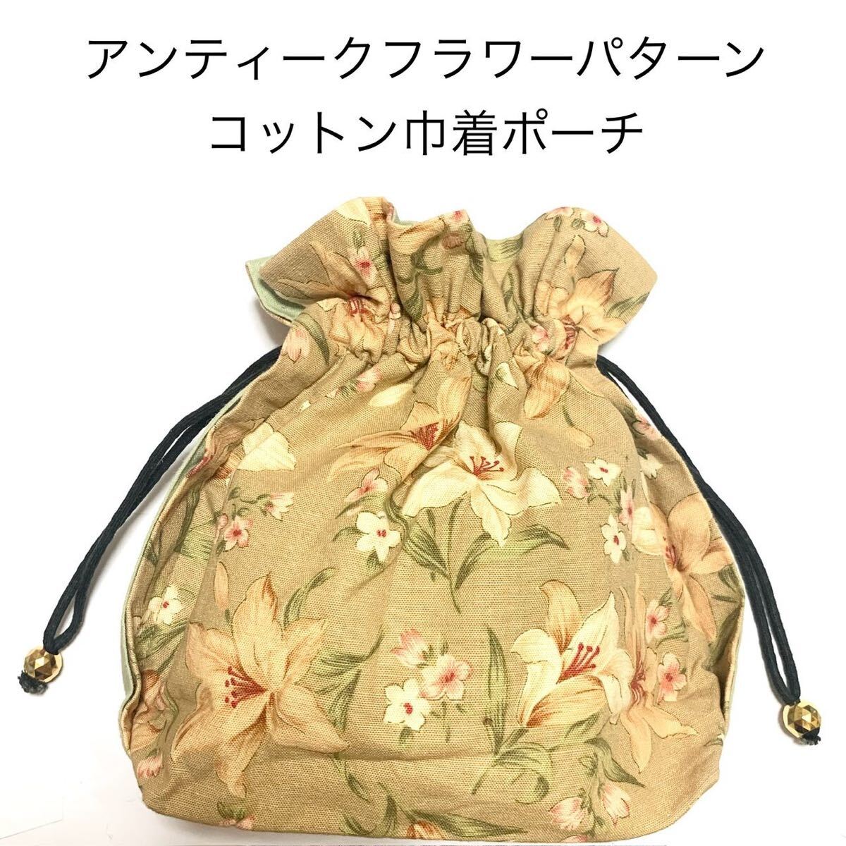 - アンティークフラワープリント コットン巾着袋 ベージュ グリーン 百合 リリー 巾着ポーチ 小物入れ