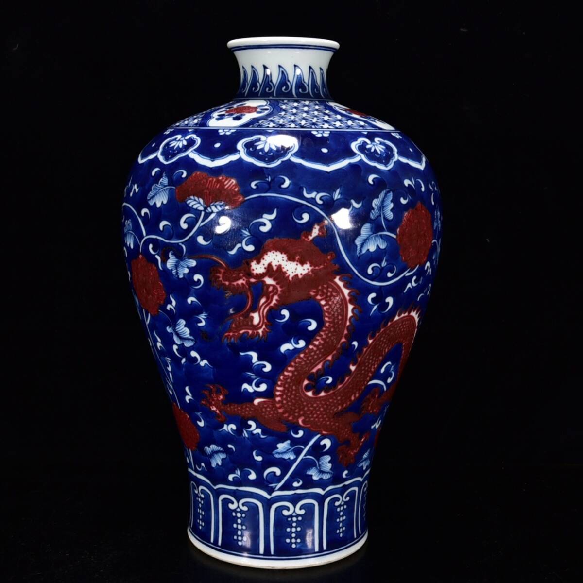 - 『館蔵珍品 清 康熙年製款 古陶瓷品 青花 釉里紅 龍鳳紋 梅瓶』置物 賞物 貴重物品 収蔵品 中国古美術