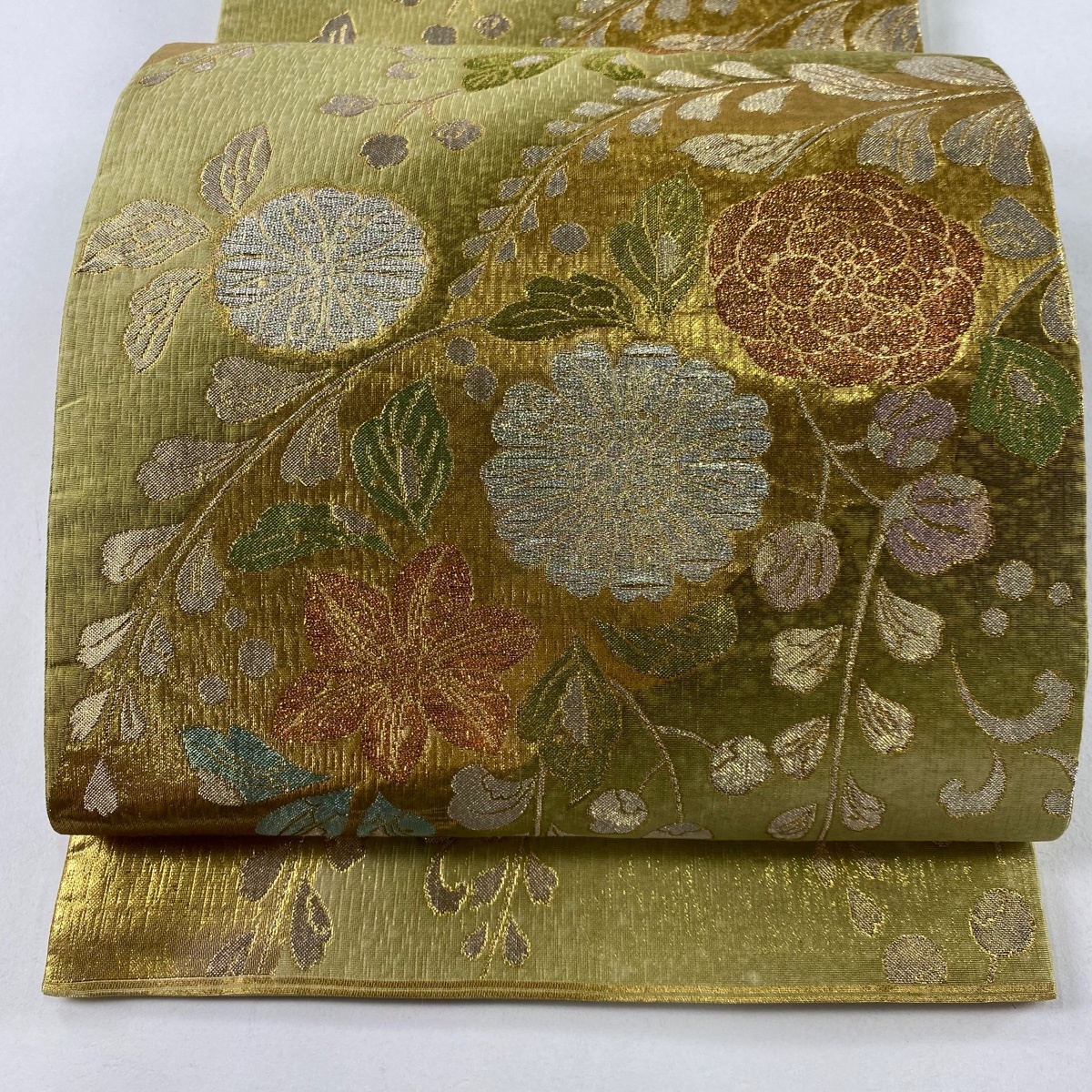 > 袋帯 美品 秀品 草花 花唐草 ラメ糸 箔 鶯色 六通 正絹 【中古】