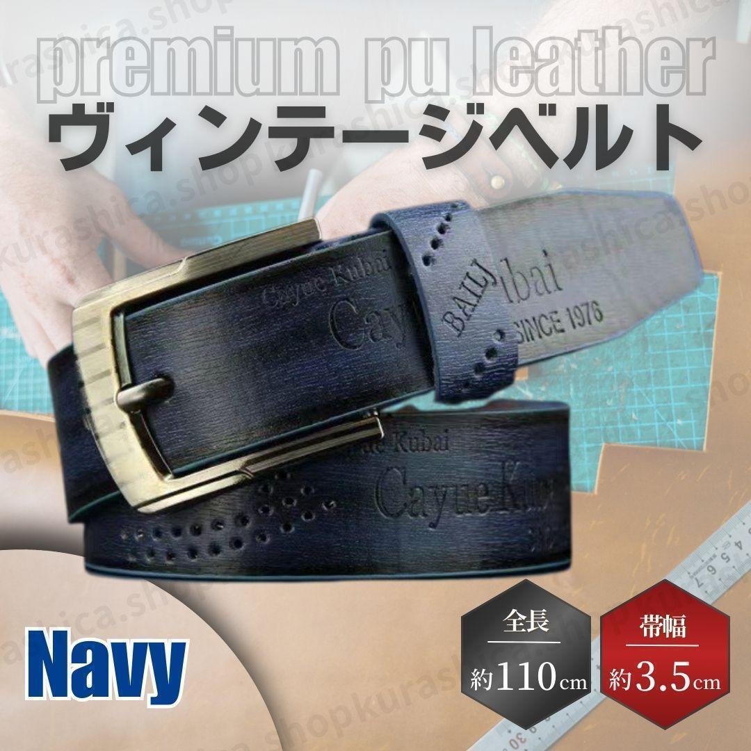 > PUレザー ベルト ヴィンテージ アンティーク ネイビー 紺色 110cm 合皮 バックル ビジネス カジュアル ゴルフ メンズ ベルト 3