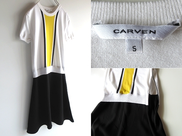> CARVEN カルヴェン ラインデザイン ニットドッキング ワンピース ドレス S ホワイト イエロー ブラック ブルーベルジャパン正規品