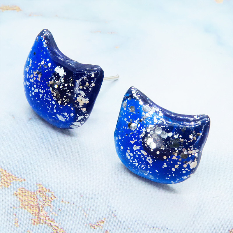 - マリンブルーレジンの猫フェイスモチーフのスタッドピアス