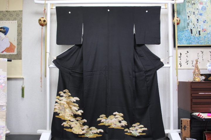 - きもの今昔8909 黒留袖紋付 比翼付き 正絹三階松柄 ベージュ系色使い ポイントは金駒刺繍 身丈163cm