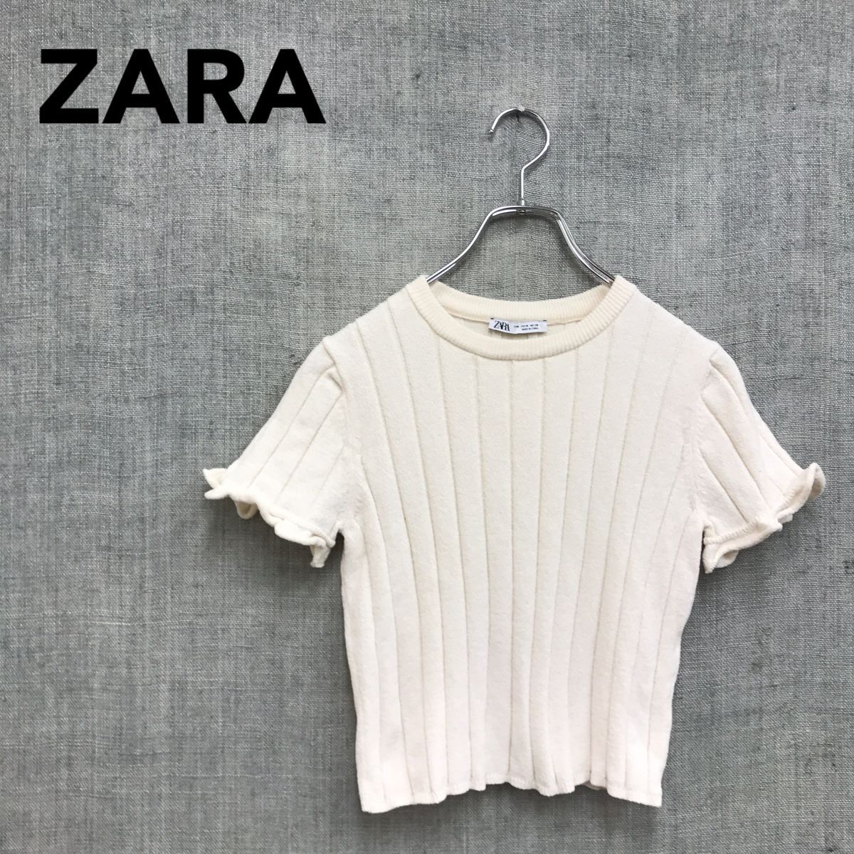 - 2H2425-R◆ZARA ザラ 半袖カットソー◆サイズM レディース 婦人 トップス リブ パイル ショート丈 春夏 オフホワイト ストレッチ