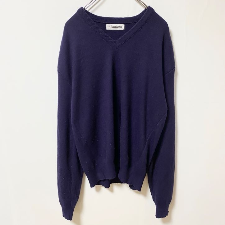 > 古着 used Jantzen 長袖Vネック無地ニット セーター ノームコア ネイビー USA製 ビッグシルエット XLサイズ