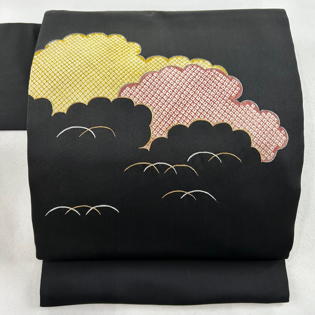 - 名古屋帯 秀品 雲文 芝 金銀糸 刺繍 墨色 正絹 【中古】