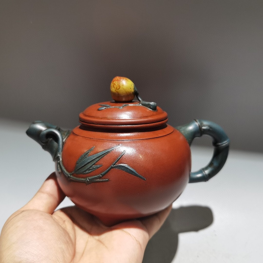 - 【超珍館蔵】紫砂壺 寿桃壺 唐鳳芝款 紅泥 茶具 茶道品 置物 賞物 古賞物 古董品 古美術品 時代物 旧家蔵出 稀少珍蔵品