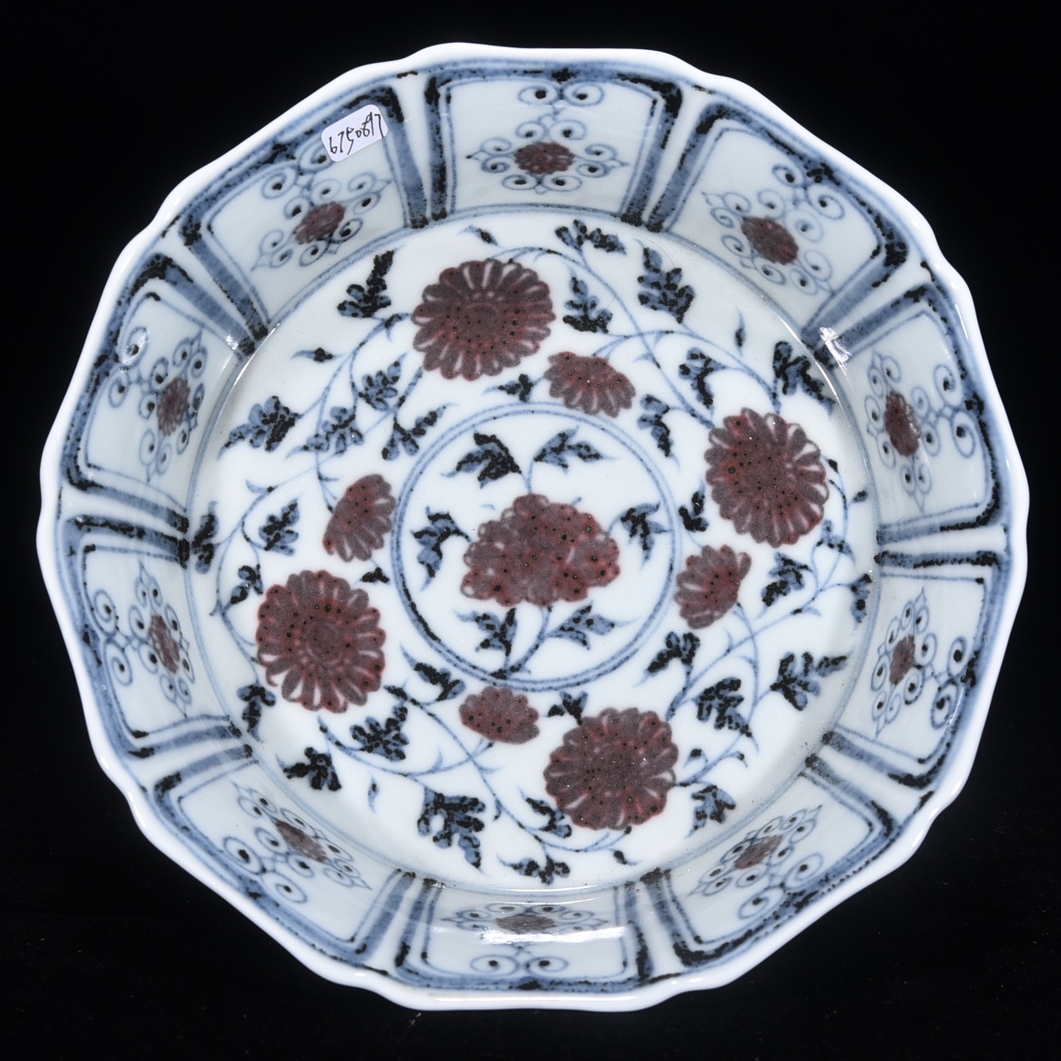 - 旧蔵 明 建文年制 青花 釉裡紅花卉紋 十角洗 陶芸 古陶磁器 中国磁器 極細工 中国古玩 骨董品 古美味 208