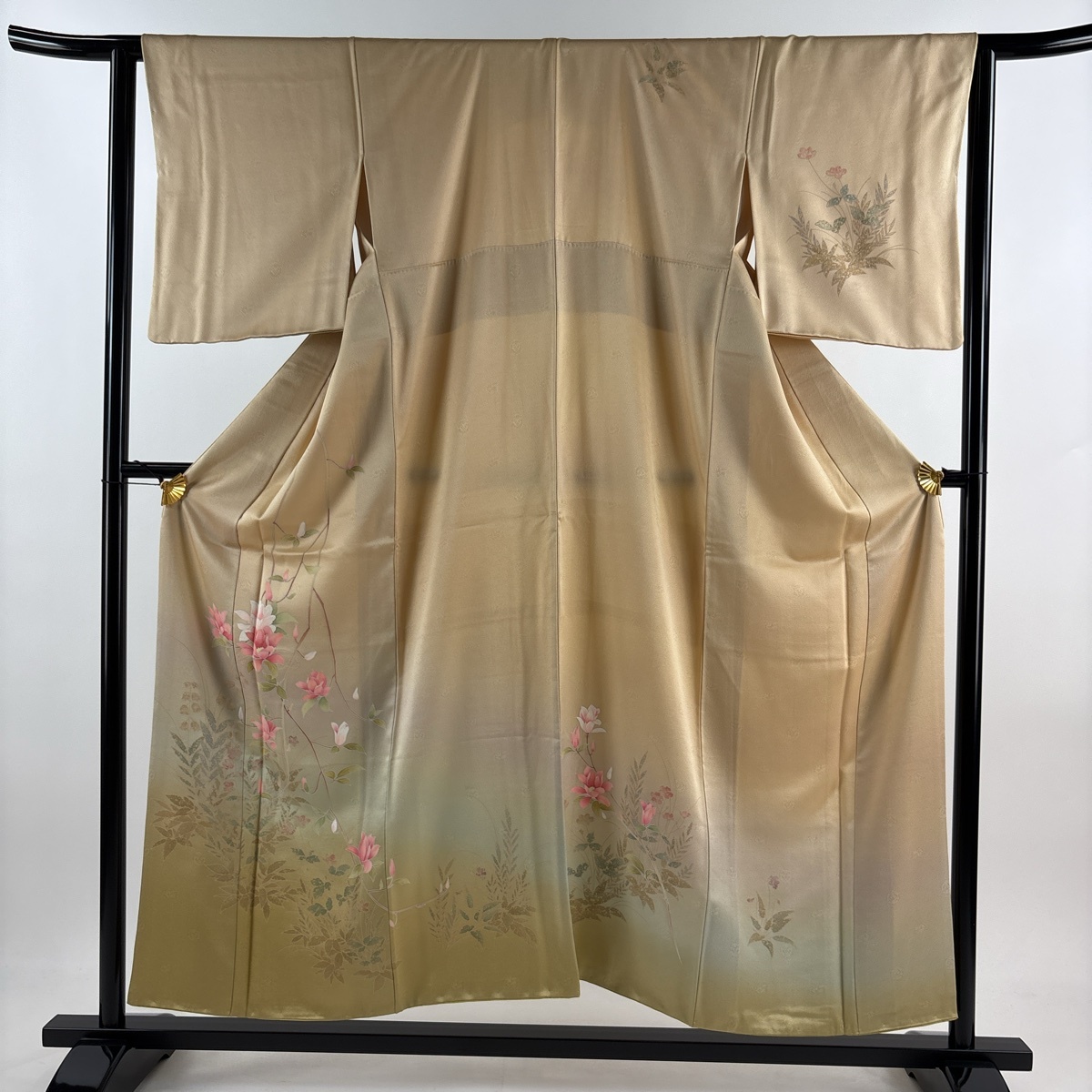 - 訪問着 身丈153cm 裄丈63cm S 袷 枝花 地紋 金彩 ぼかし 薄茶色 正絹 美品 秀品 【中古】
