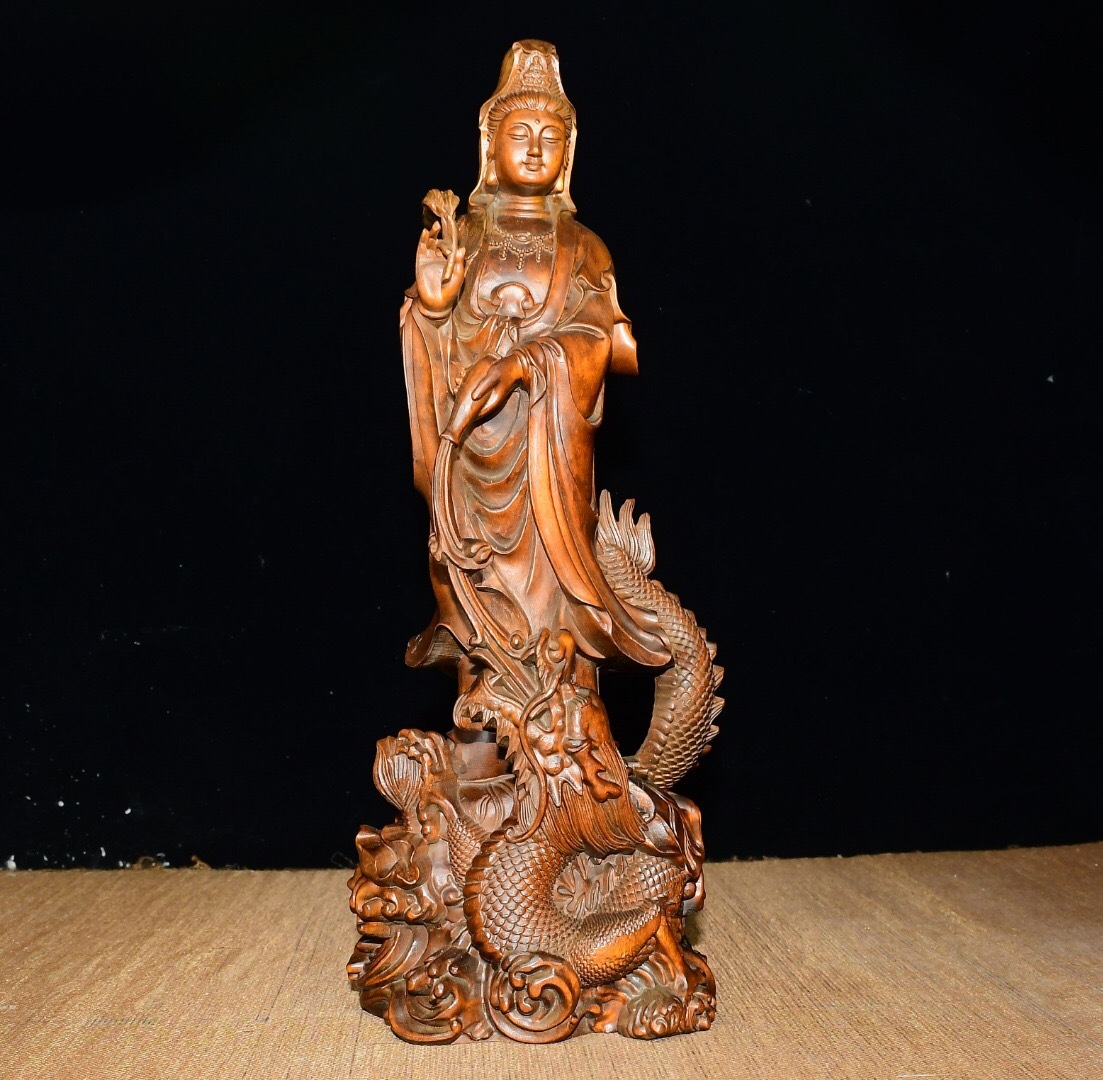 - ▽鴻▽ 黄楊木製 細密彫 祥龍觀音像 仏像 宗教 仏教古美術 供養品 古賞物 古董品 時代物 稀少珍品 中国古玩 中国古美術