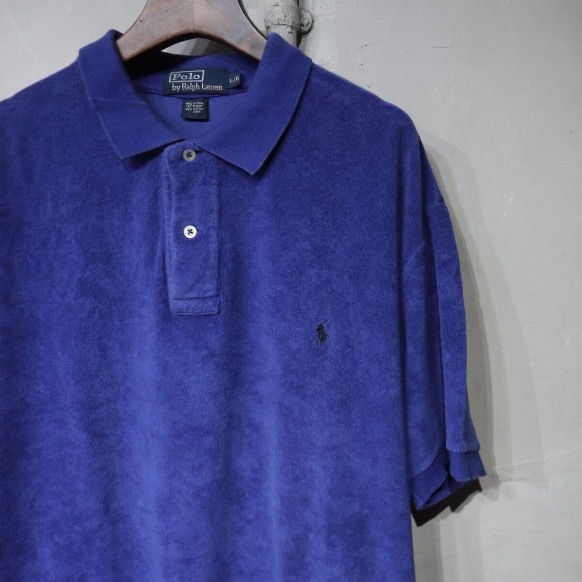 > 【即決】polo ralph lauren ポロラルフローレン ポロシャツ パイル生地 無地 ブルー ネイビー 胸ポニーマーク 古着 L