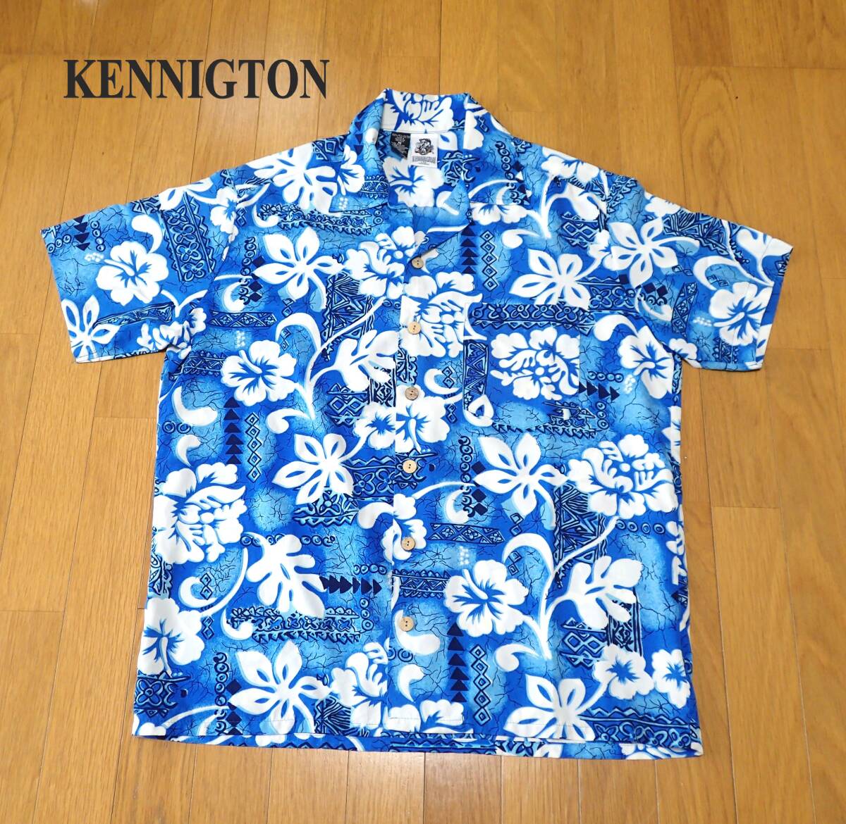 > ☆KENNINGTON ☆ケニントン ☆ハイビスカス柄 ☆アロハシャツ ☆ココナッツボタン ☆ポリエステル ☆ブルー ☆メンズ ☆M