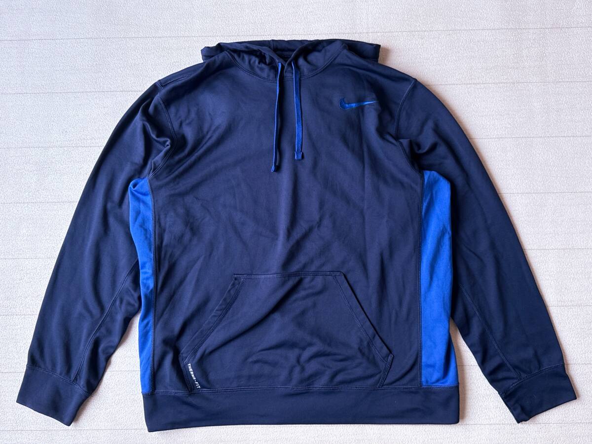 > ☆送料無料☆ NIKE ナイキ USA直輸入 古着 プルオーバー ロゴ 裏起毛 THERMA-FIT パーカー メンズ L ネイビー トップス 中古 即決