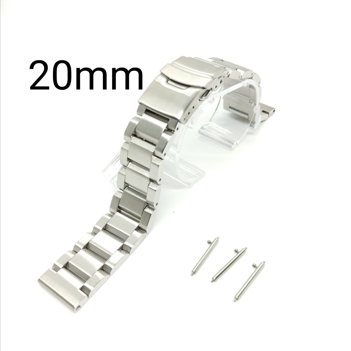 - 送料無料 腕時計 交換ベルト シルバー 3連 直カン 20mm 無垢 ステンレス バックル プッシュ式 取手バネ棒付 B37