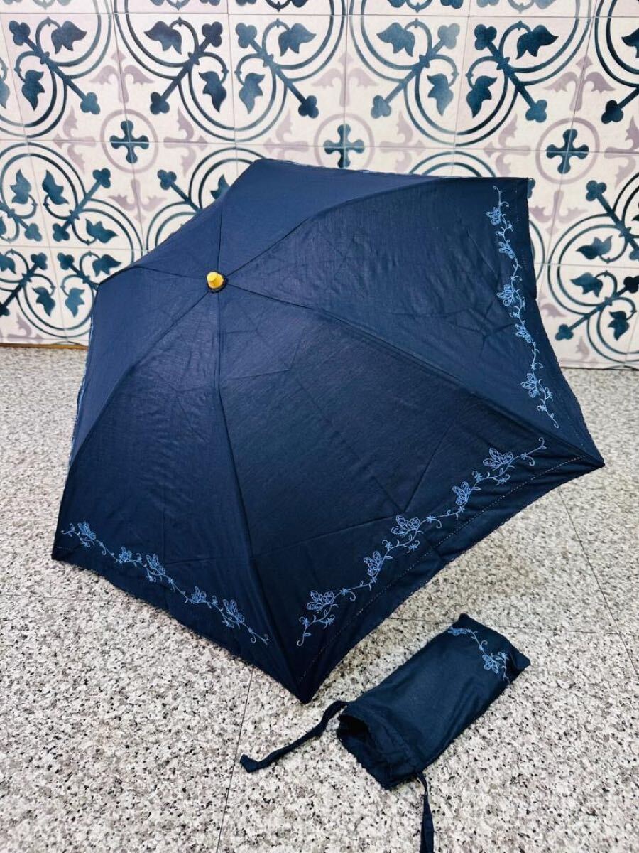 - 美品 晴雨兼用 折りたたみ傘 雨傘 日傘 花柄 刺繍 ネイビー デニム風 婦人 レディース 収納袋付き 雨具