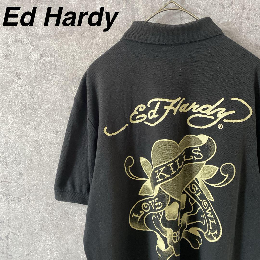 - Ed Hardy TATOOアートポロシャツ半袖 黒 鹿の子 メンズMサイズ相当