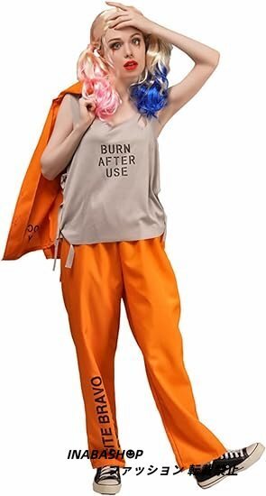 - 囚人服 ペアコスプレ ハロウィン コスチューム 囚人 仮装 メンズつなぎ レディース上下セット オレンジ 長袖