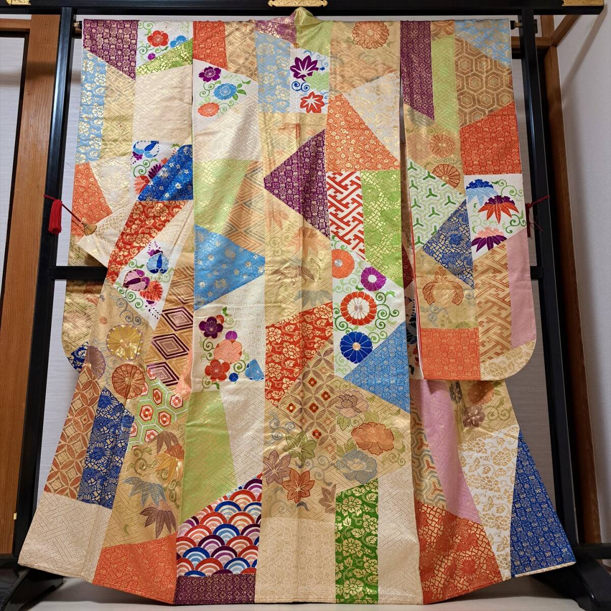 - 即決■着物の越田■裄66身丈164.5 正絹 振袖 袷 一つ紋 金彩加工 刺繍加工 伊達襟 うそ付襟 古典的 華やか 成人式■み26R01
