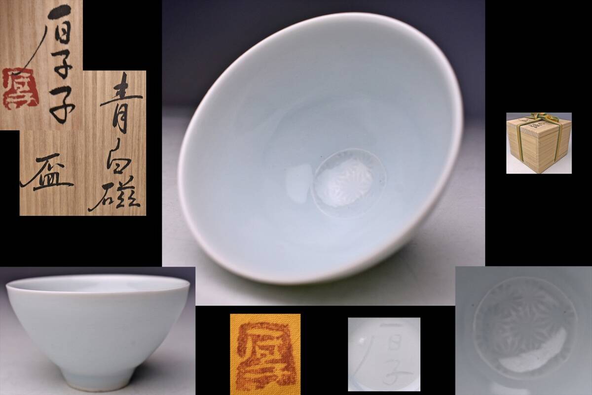 > 久保田厚子 ★ 青白磁ぐい呑 ★ 共箱共布 ★ 見込みに デザインあり ★ 東京芸大出身 ★ 酒器 ★ 清涼感